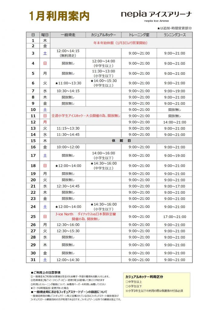 nepiaアイスアリーナ1月利用案内の一部訂正について