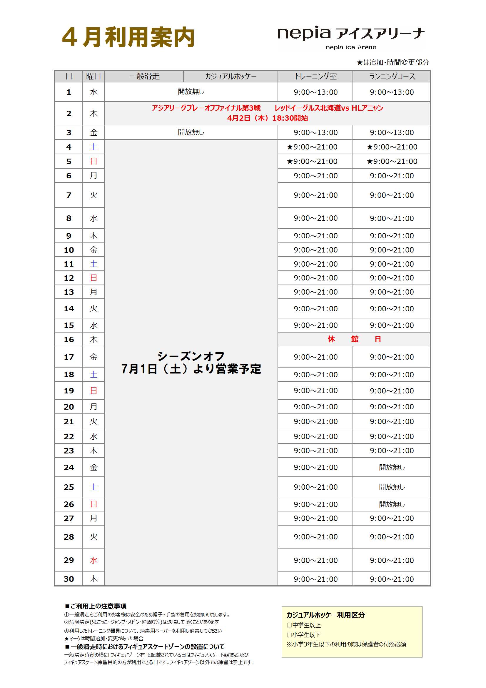 令和7年7月1日~令和8年3月31日 nepiaアイスアリーナ - 営業時間