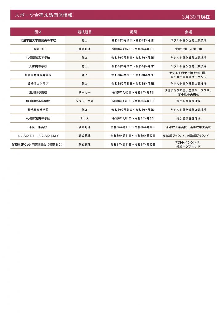 令和8年度スポーツ合宿来訪団体情報 2026.03.31お知らせ 令和8年3月30日までに、予約がありましたスポーツ合宿来訪団体をお知らせいたします。なお、全て見学可となります。 一覧へ戻る 過去の記事